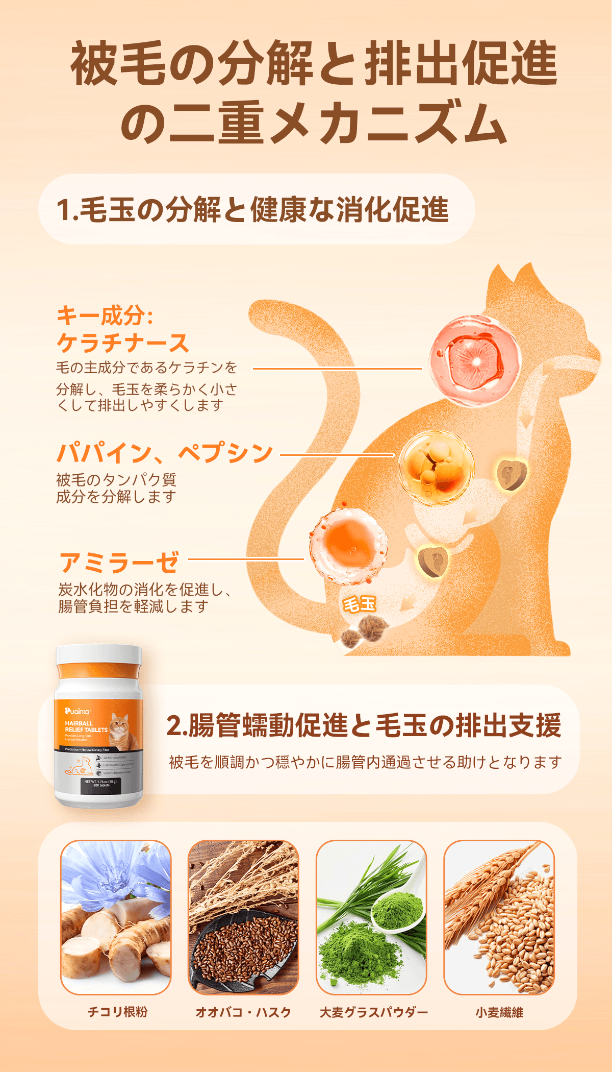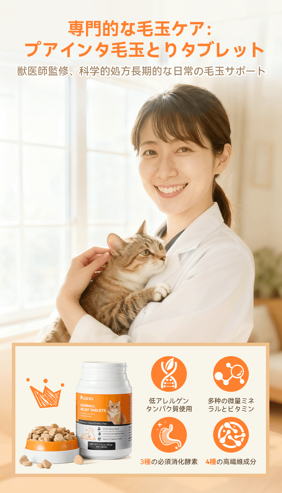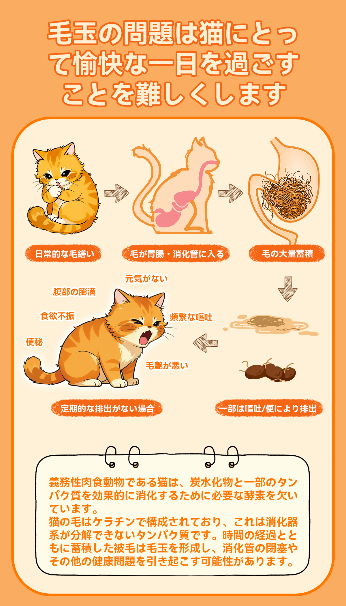 毛玉吐きの心配を減らし、元気で幸せな毎日を愛猫に。 獣医師監修の安心処方で、大切な家族を優しく守ります🐱✨