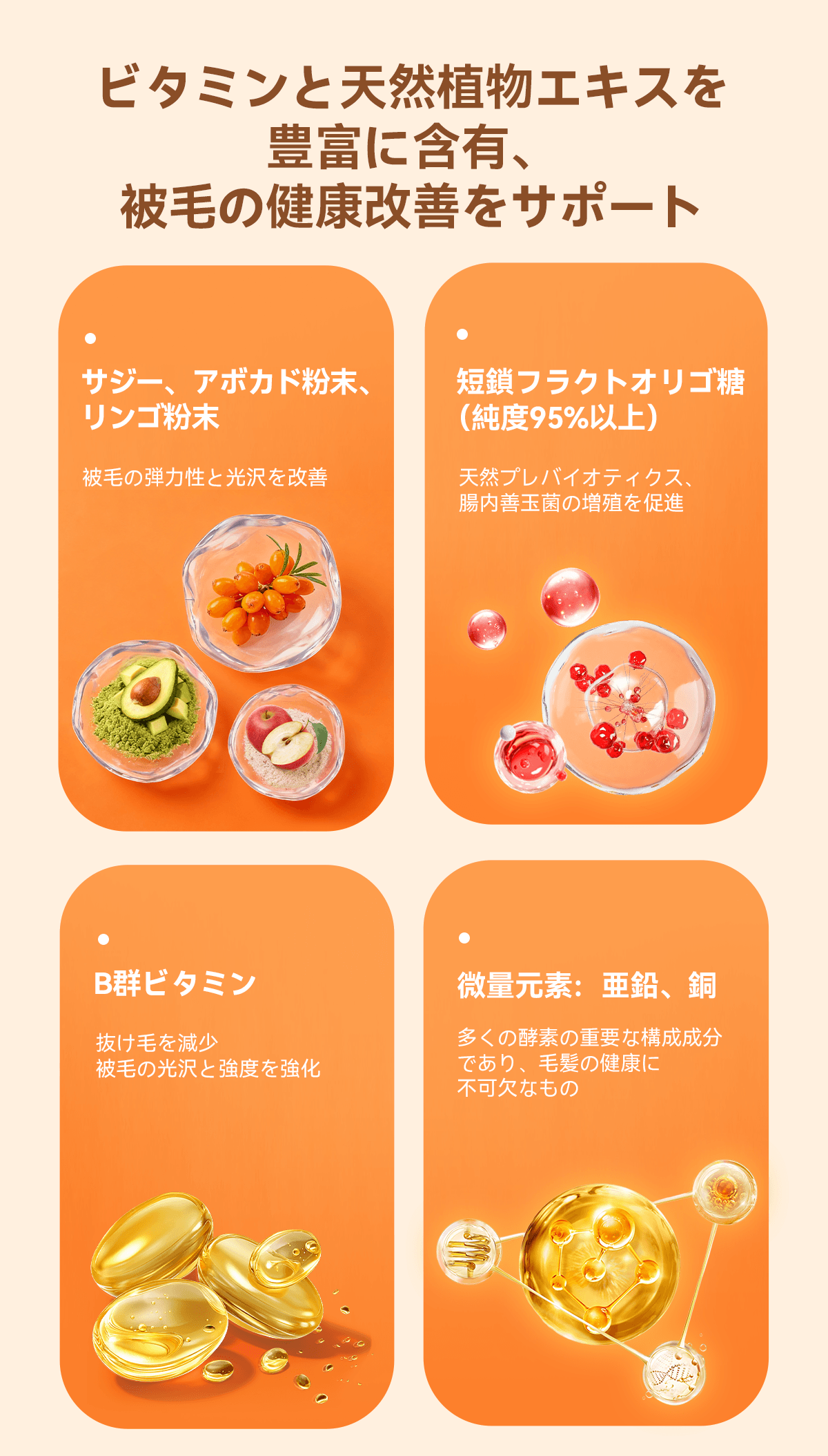 ・タウリン&ビタミンB群・ビオチン配合で、毛並み美しく健康プラス。