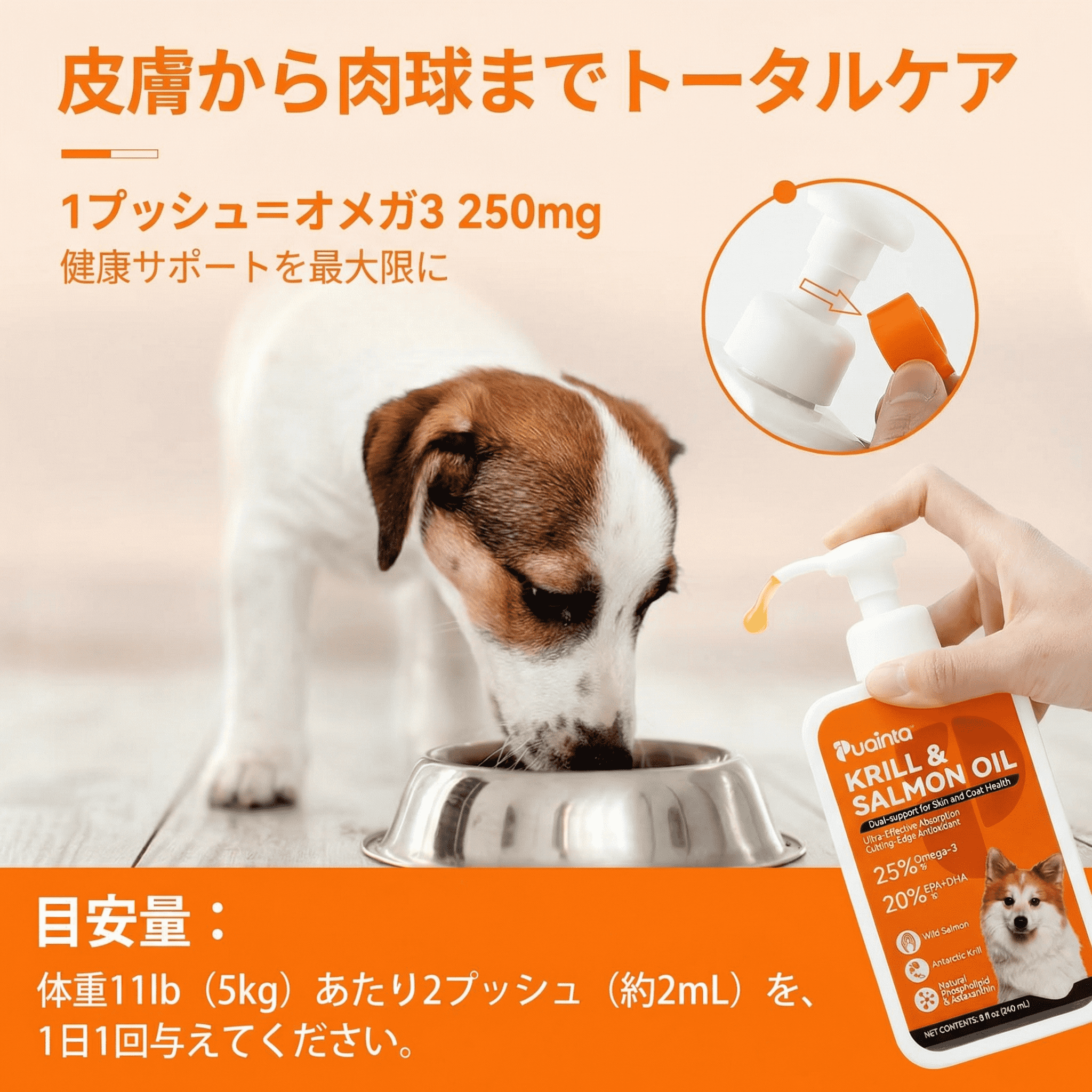 目安量:体重5kgあたり2プッシュ (約2mL) を、1日1回与えてください。