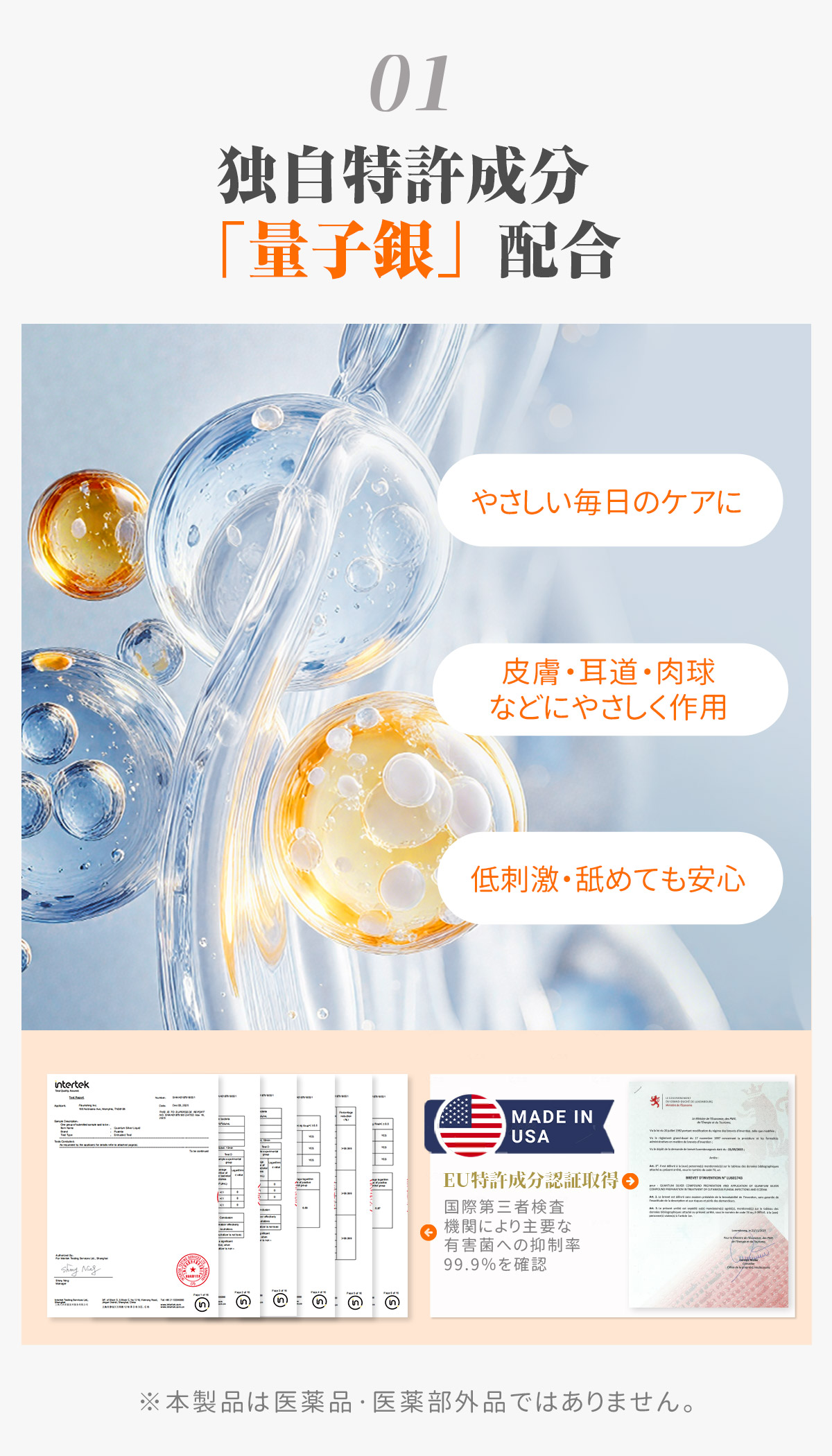 プロの獣医師との共同監修のもと、臨床実証済みの革新的な科学成分:量子銀+先端植物エキス(カモミール花油)を採用。