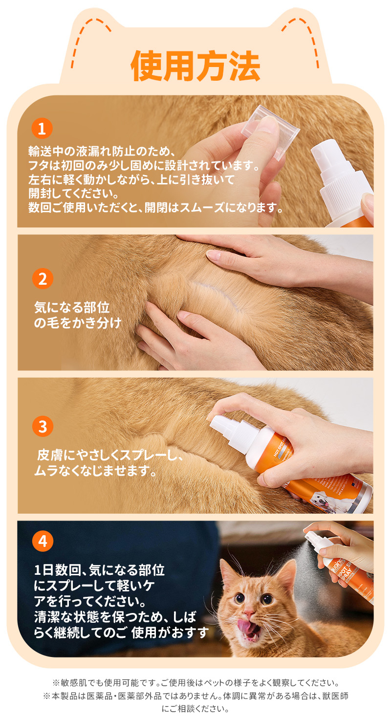 ・患部の被毛を刈り取り、患部の皮膚が湿る程度にスプレーしてください。